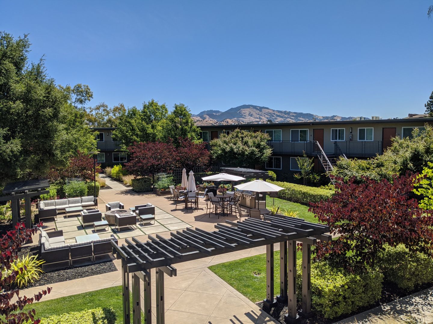 Gather outdoors with loved ones or neighbors and enjoy our central courtyard with comfy seating areas, gas grills, and a cozy fire pit. Enjoy beautiful views of rolling hills and Mt. Diablo.